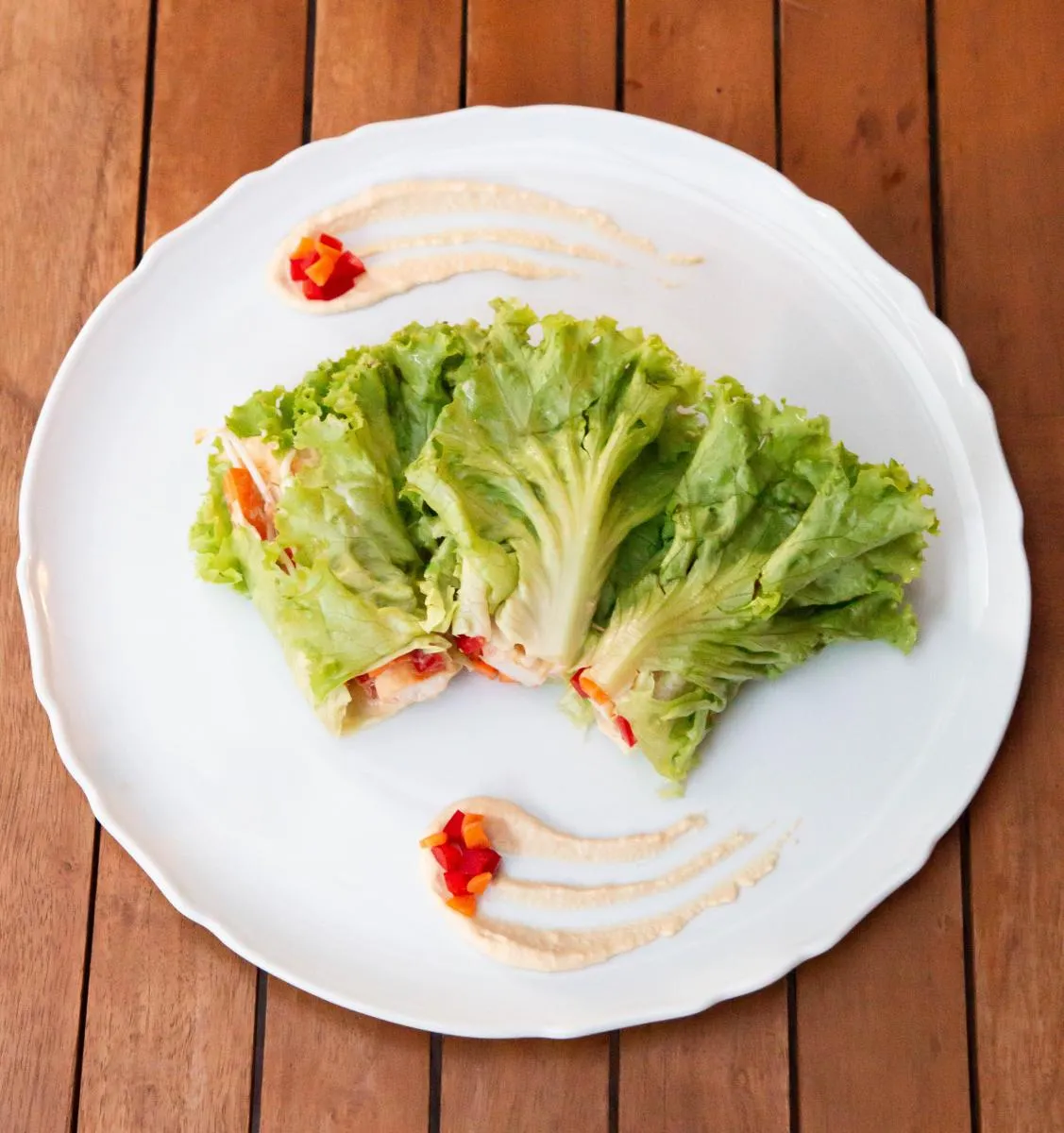 - Sestavljanje zavitka: Na list solate nanesite žlico humusa, dodajte piščančje trakove, korenje in papriko.